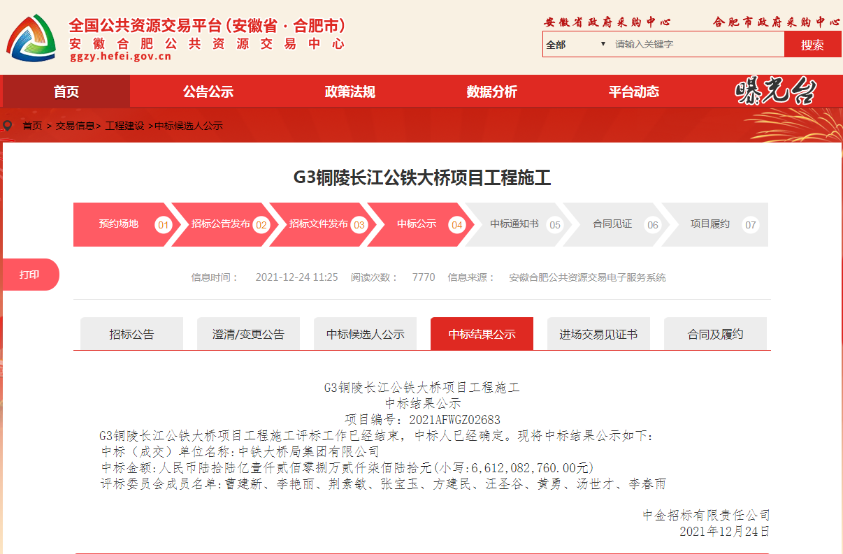 安徽合肥公共資源交易中心鏈接:G3銅陵長(zhǎng)江公鐵大橋項(xiàng)目工程施工中標(biāo)候選人公示