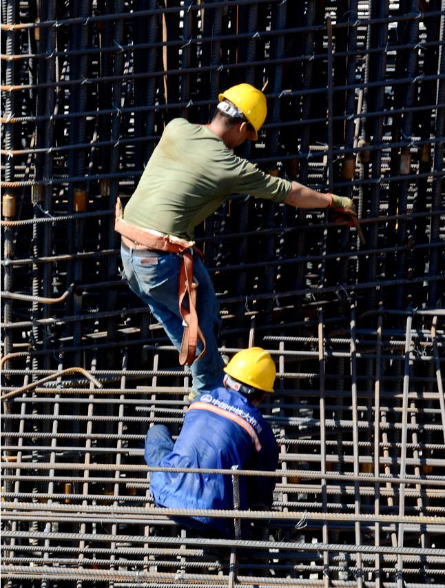 焊花飛舞、機(jī)器轟鳴,上午6時不到,鋼筋綁扎工劉友勇就和工友穿梭在“鋼筋森林”中。在下游側(cè)承臺9米多高的作業(yè)平臺上,劉友勇像蜘蛛人一樣緊貼著剛捆扎好的“樹干”,正在綁扎南主墩塔座鋼筋。承臺上沒有任何遮擋,劉友勇和工友們完全暴露在烈日下。雖然天氣很熱,但幾乎所有鋼筋工都戴著厚厚的手套,不少人的手套甚至還磨破了。“現(xiàn)在這時候,鋼筋表面溫度有六七十?dāng)z氏度。不戴手套拿不了鋼筋,很燙的?!眲⒂延乱贿呅χ贿呑プL燙的鋼筋,嚴(yán)格按照圖紙尺寸和間距,一根一根地將鋼筋綁扎固定起來。由于長時間觸摸滾燙的鋼筋,他的手套一直處于被汗水濕透的狀態(tài)。