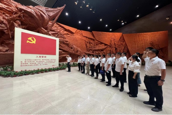 在渡江戰(zhàn)役紀(jì)念館內(nèi),G3公鐵橋項(xiàng)目部第一黨支部書記趙懿帶領(lǐng)全體黨員同志,面向黨旗,高舉右拳,莊嚴(yán)宣誓,在字字鏗鏘中重溫入黨誓詞,抒發(fā)對黨忠誠的堅(jiān)定決心。黨員同志在講解員的帶領(lǐng)下,依次參觀戰(zhàn)前形勢、戰(zhàn)役準(zhǔn)備、突破江防、戰(zhàn)役勝利、人民支前和英烈業(yè)績六大展廳,通過大量實(shí)物、圖片和文物資料,與歷史“對話”,與英雄“交流”,感受西梁山戰(zhàn)役的英勇、搶灘登陸的緊迫、烈士名錄廳的沉重,深刻感悟黨團(tuán)結(jié)帶領(lǐng)人民歷經(jīng)千難萬險(xiǎn)攻克難關(guān),創(chuàng)造奇跡的革命歷程。